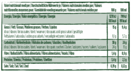 Zutaten des Eises (85%):Soja-Getränk* (45%)(Wasser, Sojabohnen*(8%), Meersalz), Roh-Rohrzucker*, Kokosöl*, Glucose sirup*, geröstete Haselnüsse* (4%), Maltodextrin*, magerer Kakao*, Sonnenblumenöl*, Erbseneiweiß*, Stabilisatoren: Gummiarabicum* – Johannisbrotkernmehl* – Guarkernmehl*, natürlicher Vanille extrakt*, Emulgator: Soja lecithin*